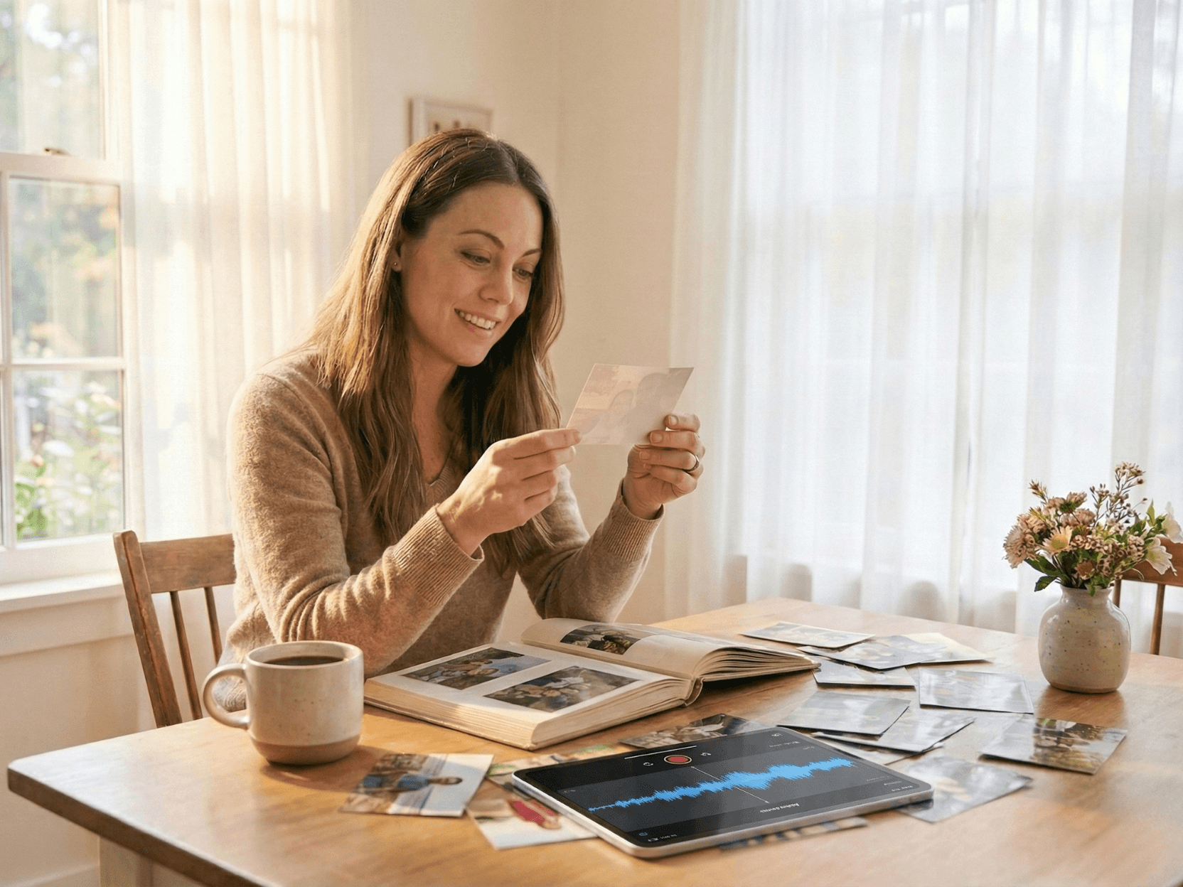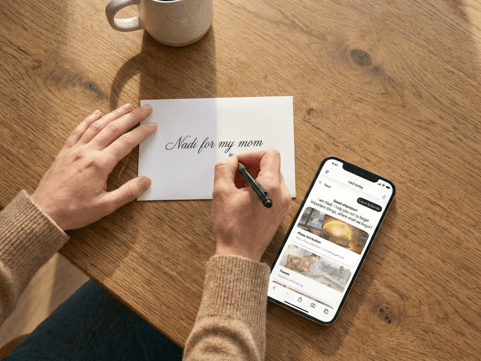 Вы рассказываете голосом, а Nadi задаёт короткие уточняющие вопросы и записывает всё важное. Старые фото вы тоже подписываете голосом — кто на снимке, где и когда это было, что происходило.